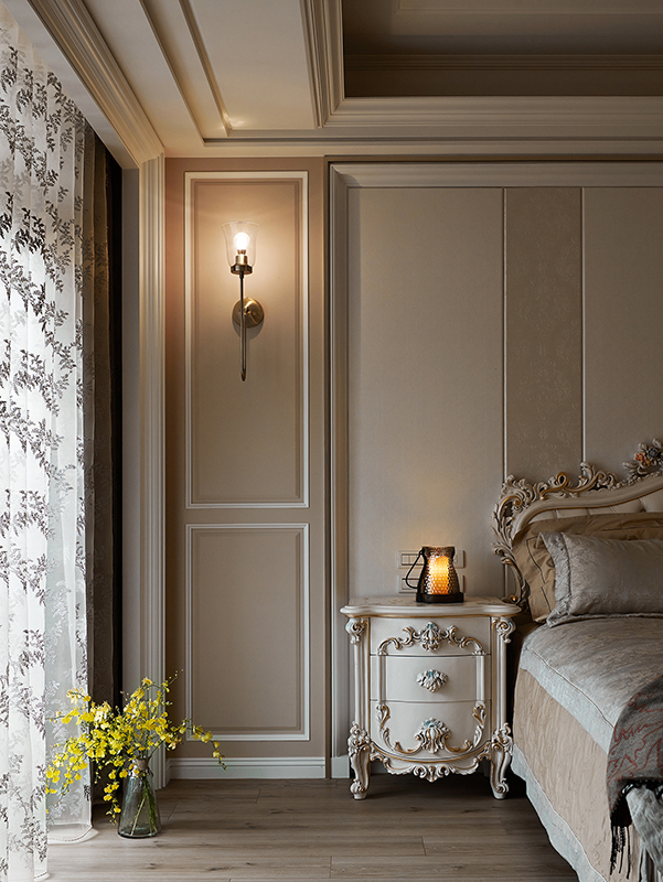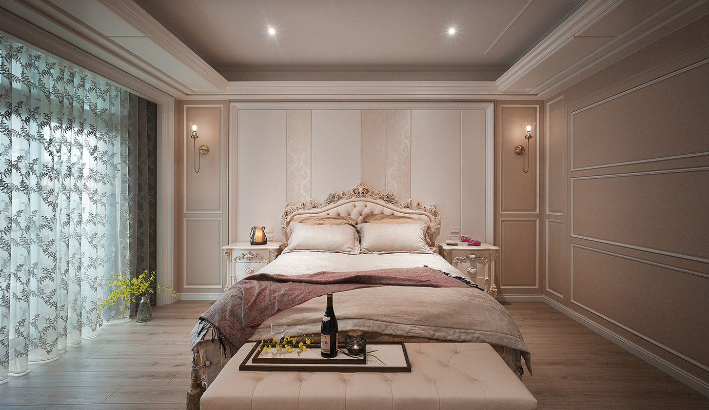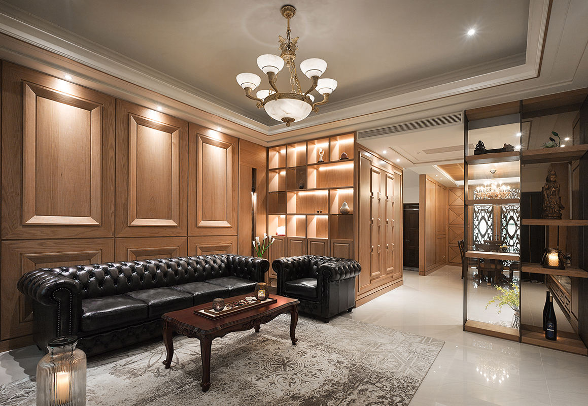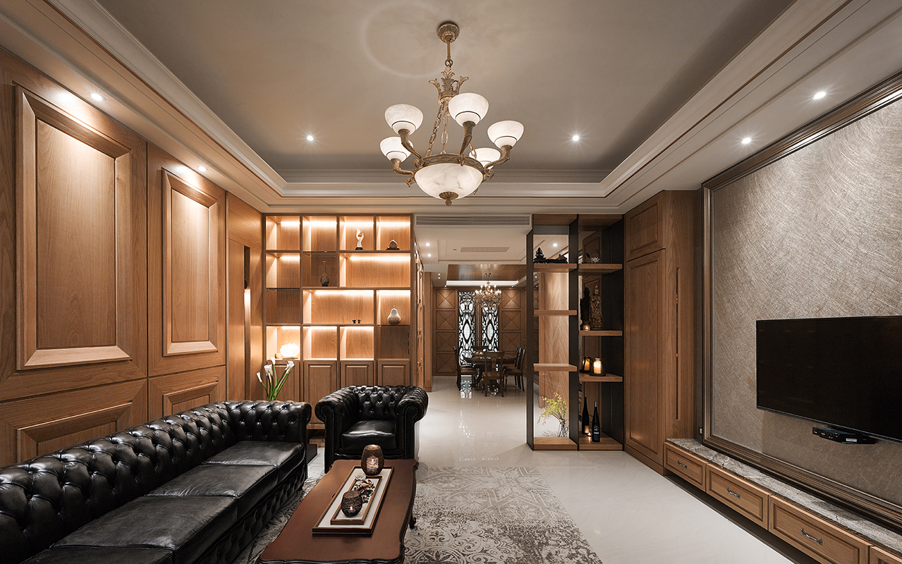 設計團隊以造型線板搭配釘扣皮製沙發與地氈,為公領域注入古典歐式之美,電視牆則採用大地色調,回歸大器簡約。利用兩側櫃體巧妙框設客廳通往餐廳的過道,重整餐廳與獨立廚房格局,利用雕花門片延續歐式風格,並加上落地鏡面成功達到放大空間效果,並讓 L 型設計給予獨立廚房寬裕的烹飪空間。主臥以柔美色調與線條細緻的壁板與家具延續古典風格,比照歐式格局注入起居功能,更利用通往衛浴的動線打造大型更衣間與梳妝台。本案更著重燈光與建材的互動,襯托出建材的本質、打造充滿質感的視覺端景,滿足祖孫三代的居住想望。