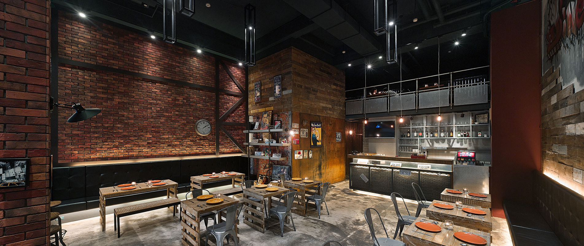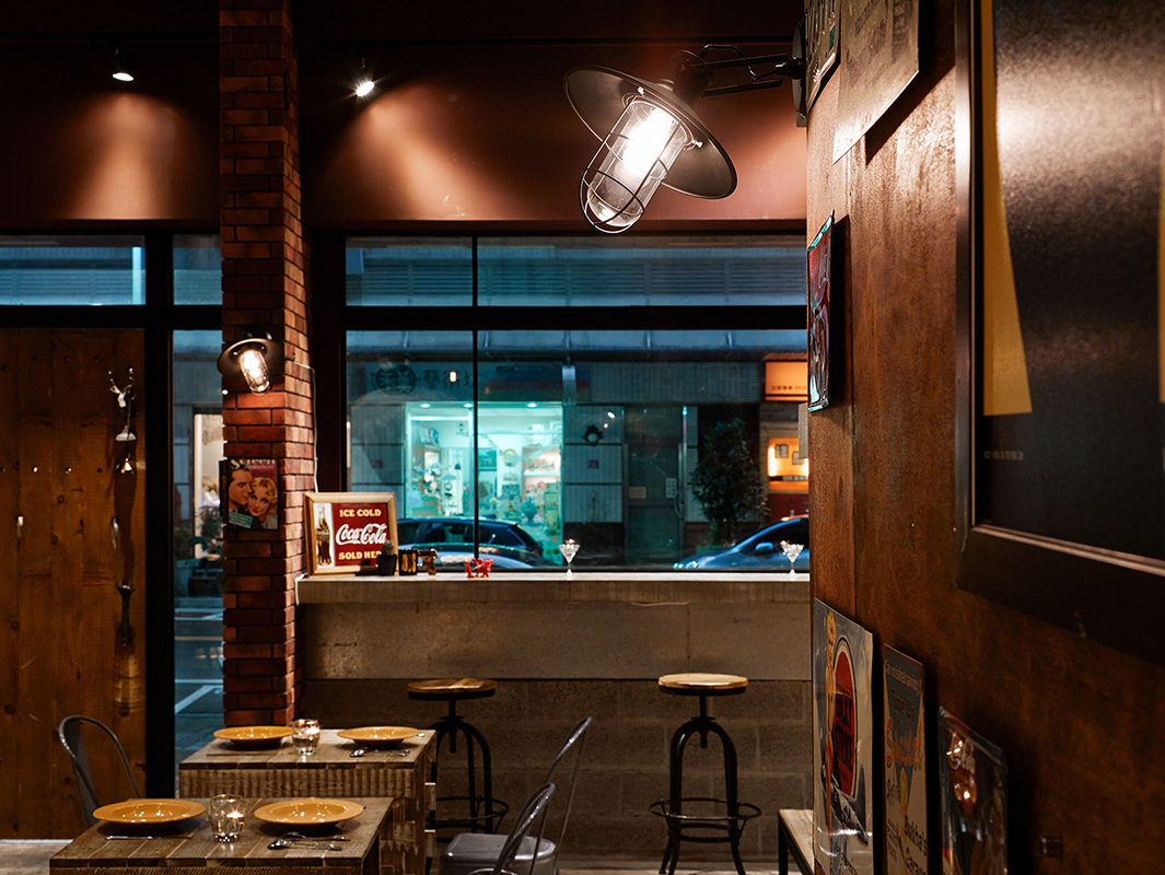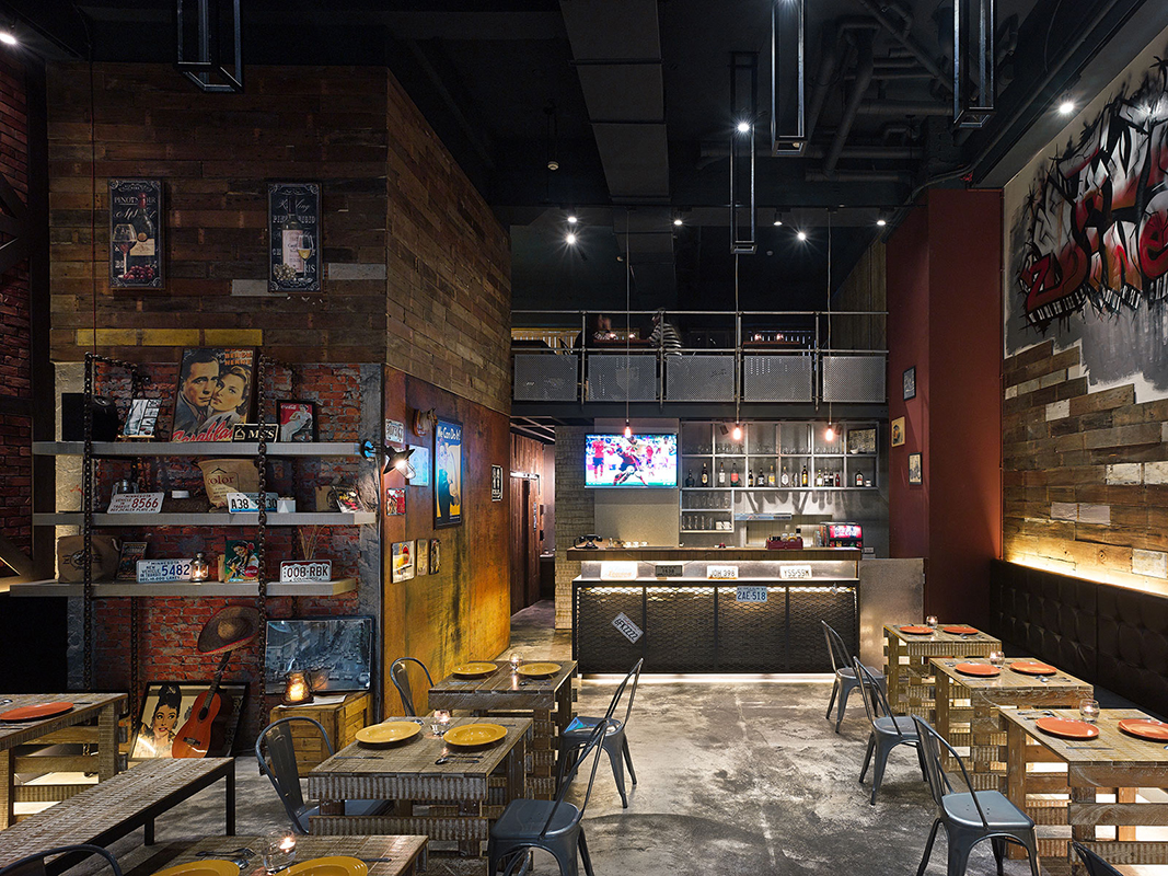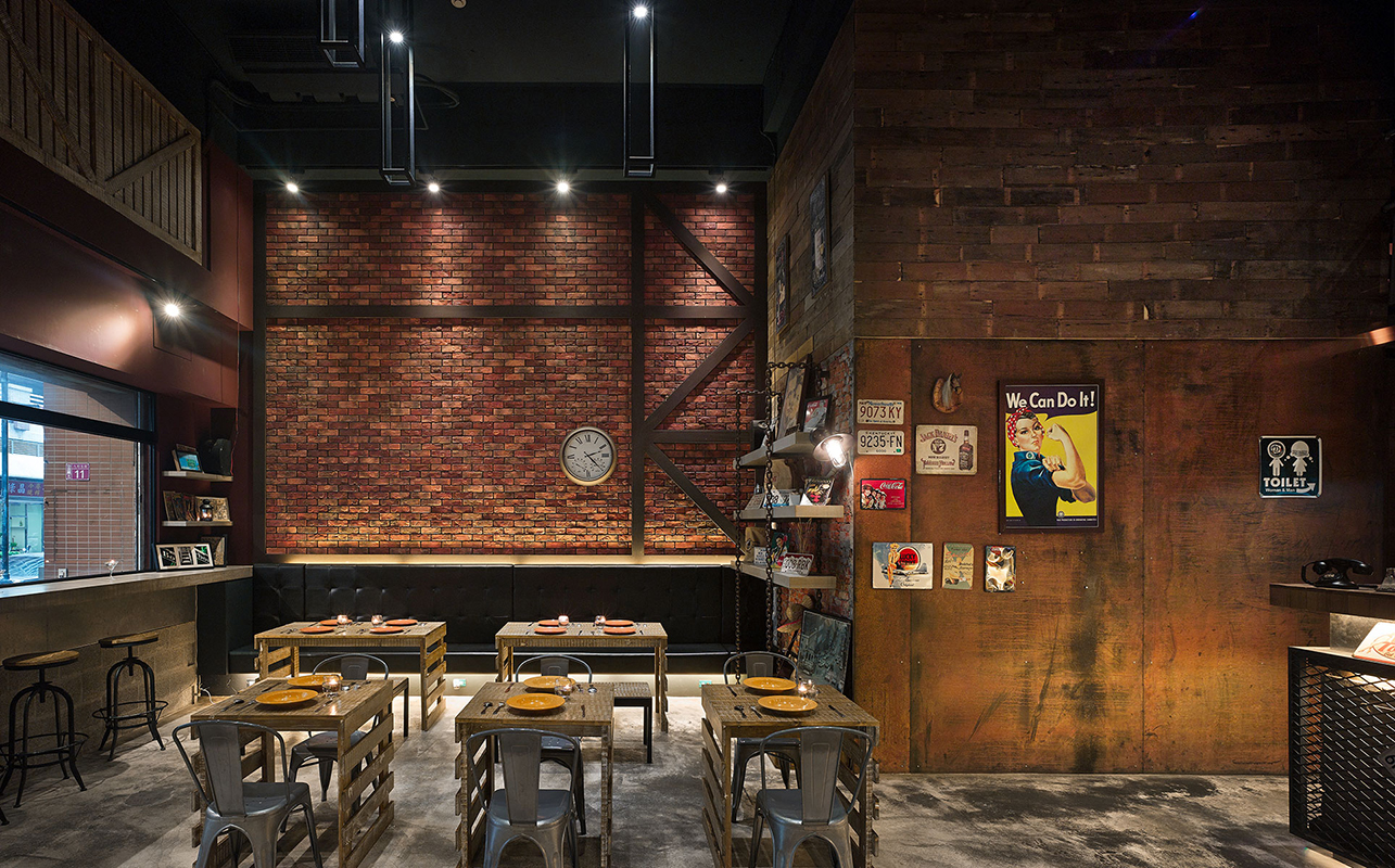 整體運用挑高規劃,開啟有別於一般店面的空間張力,並藉由斑駁牆面、粗獷鐵鍊及裸露於外的天花管線等,鋪述出自由不羈的氛圍,再搭配隨興的畫飾軟件,平衡過於冷硬的主體調性,帶出街頭藝術感;牆面上,則分別以紅磚、木作等素材疊砌而成,透過水平堆疊、橫向穿插的交錯型式,衍生視線的無盡延伸,同時將鐵椅、木桌進行混搭,在仿舊痕跡的修飾之下,徹底展現工業風的極致精髓;而一幅巨型塗鴉牆更成功凝聚焦點,型塑張力十足的牆面表情,給人跳脫現實、有如置身在紐約街頭的錯覺!