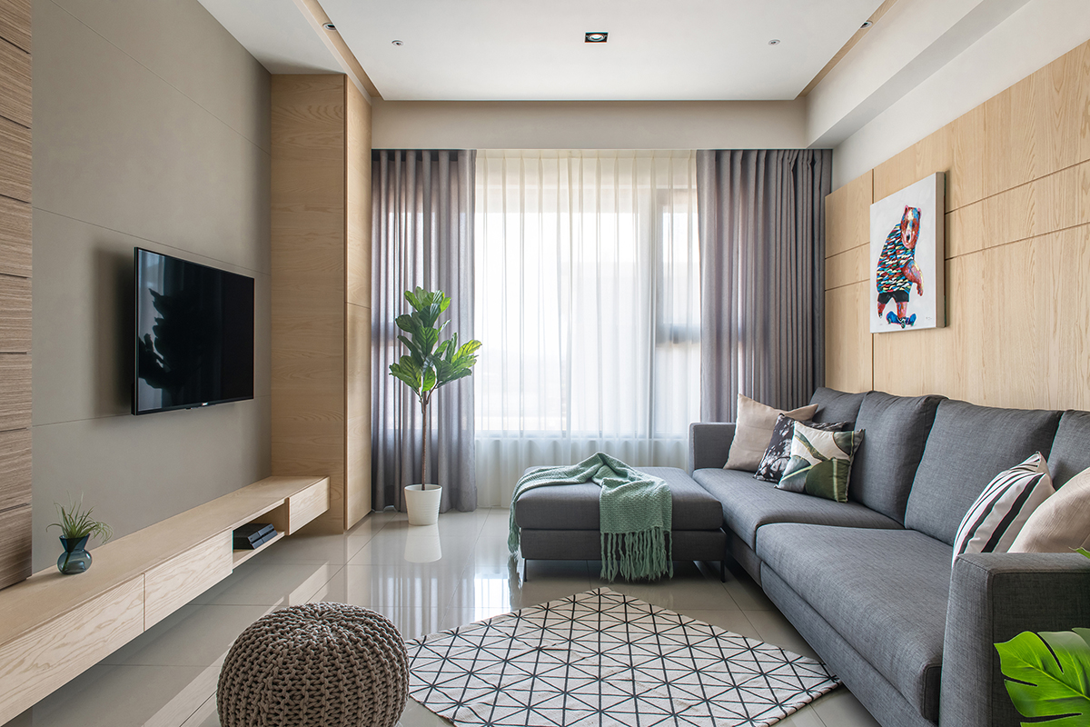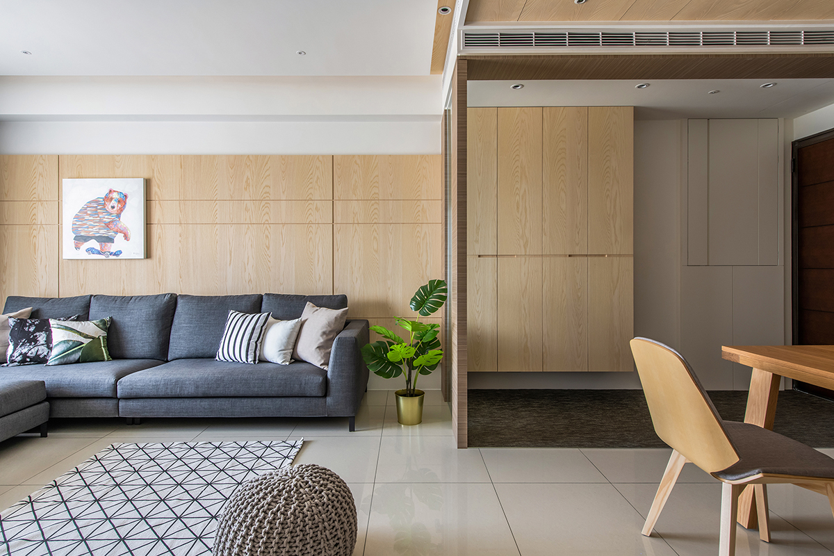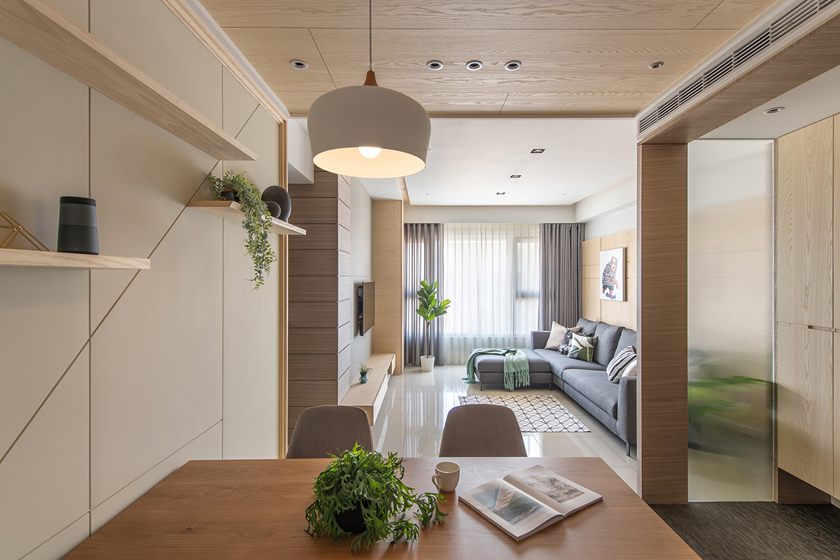 格局設定上,將玄關、客廳、餐廳整合為一方正空間,透過屏風配置、地坪材質的轉換,來界定不同場域範圍,並於入口玄關配置整面鞋櫃,採木皮修飾櫃面,營造溫潤輕盈的量體印象,屏風則使用冰柱玻璃導引採光,衍生穿透視感;餐廳區塊,於其中一面牆做出線條勾勒,搭配層板形成展示畫面,另一面牆則善用柱體與柱體之間的深度打造餐櫃,搭配著中段的展示空間,美觀與機能性兼具;客廳沙發背牆加入木質建材,保有上下段的懸空,既緩解上方樑體的壓迫,也呈現多變的立面表情,並在電視牆左側加入假柱,將材質延續包覆至轉角,解除走道的狹長視覺感;主臥,將浴室門片改為隱藏門並隱於床頭,加以簡約色調與線性修飾,營造清爽的立面造型!