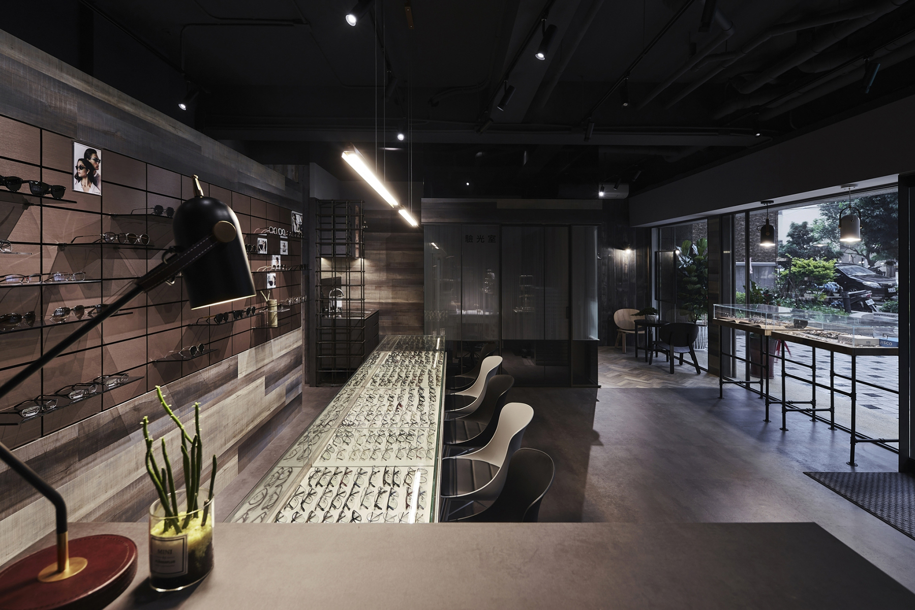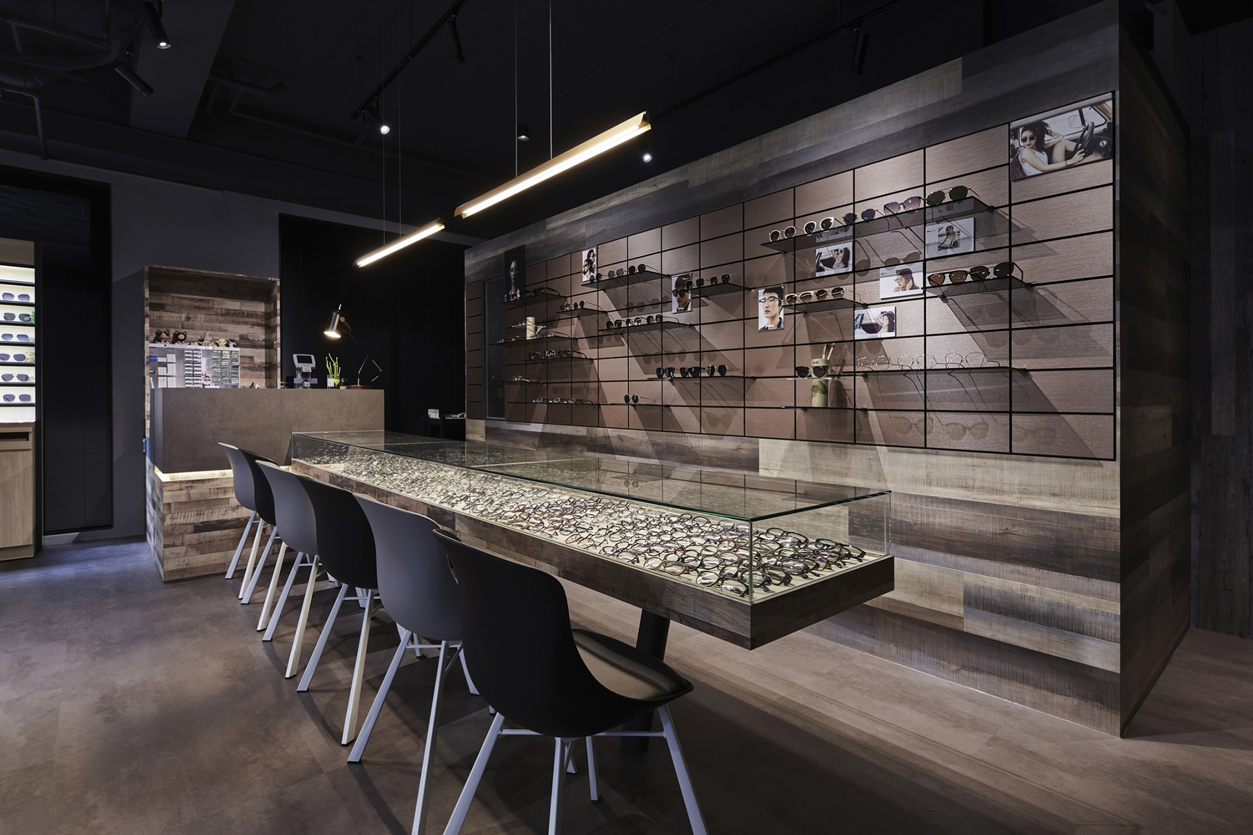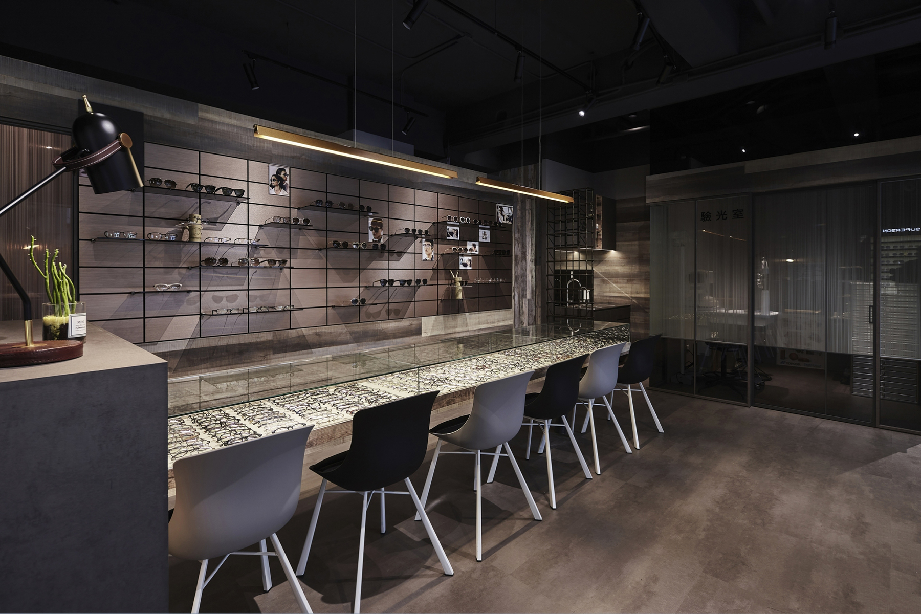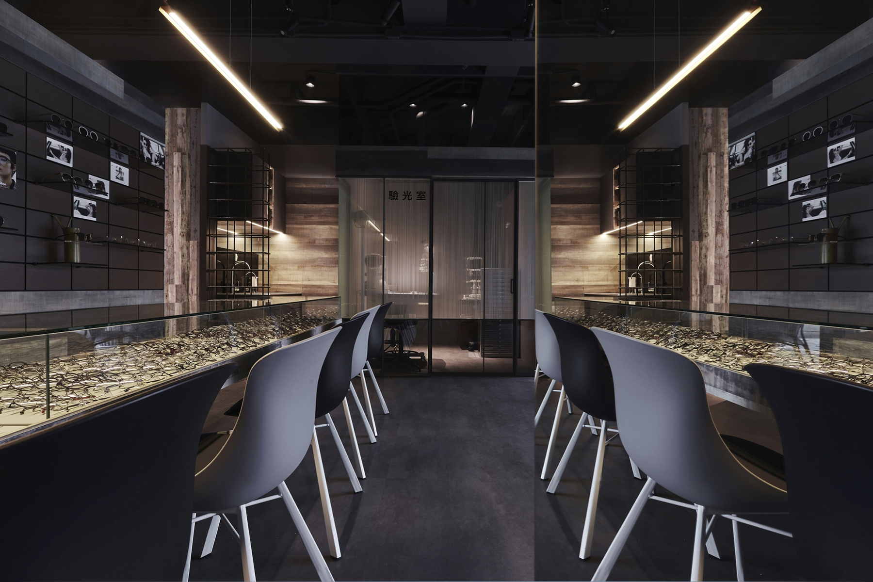 黑、白、灰的純粹語彙,交織出這間極具現代感的眼鏡空間。運用俐落線條與鏡面反射,鋪陳秩序感與細節層次,低調展現品牌專業度。幾何切割與燈光設計穿插其中,彷彿鏡框結構的延伸,塑造理性而富有層次的視覺美感。