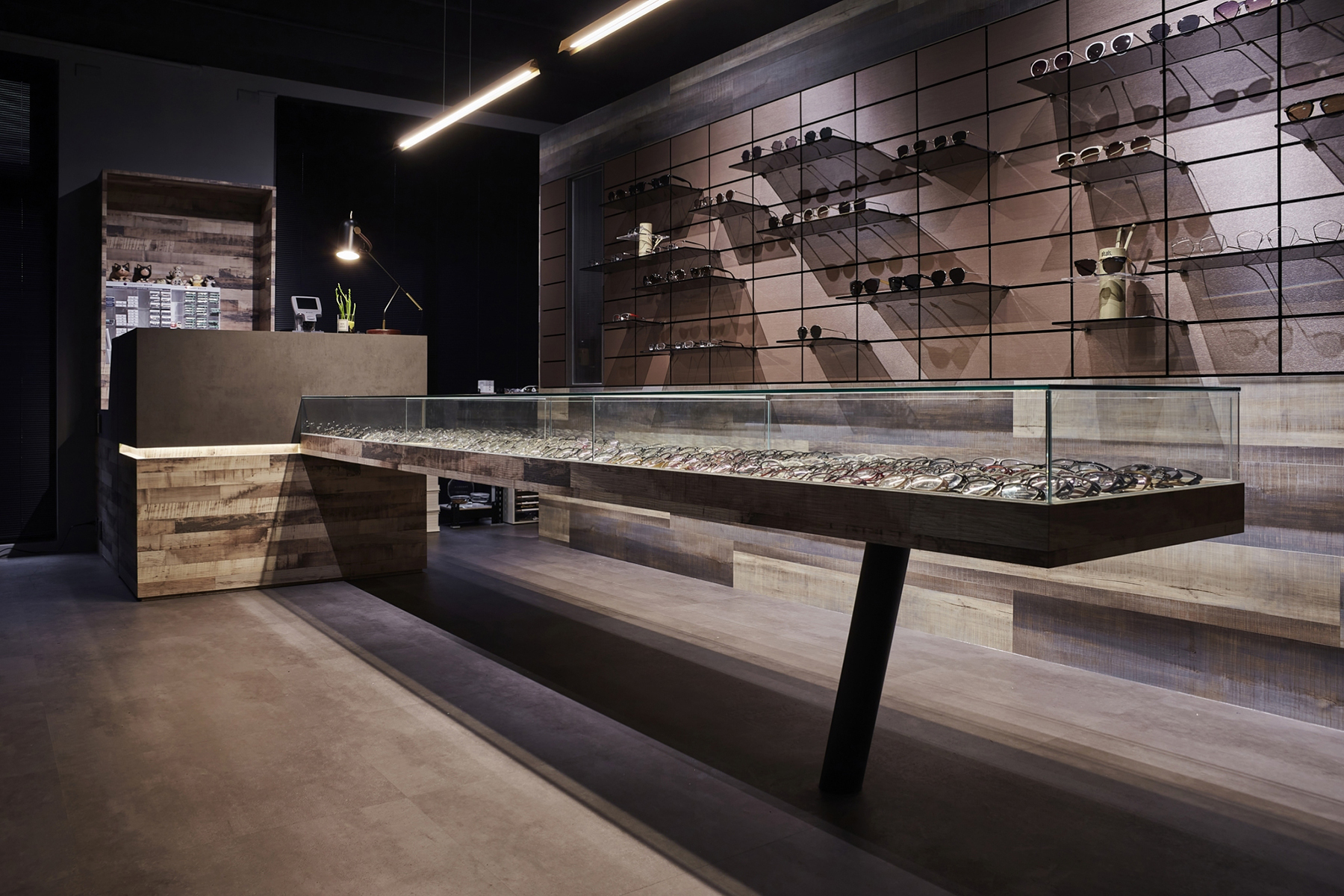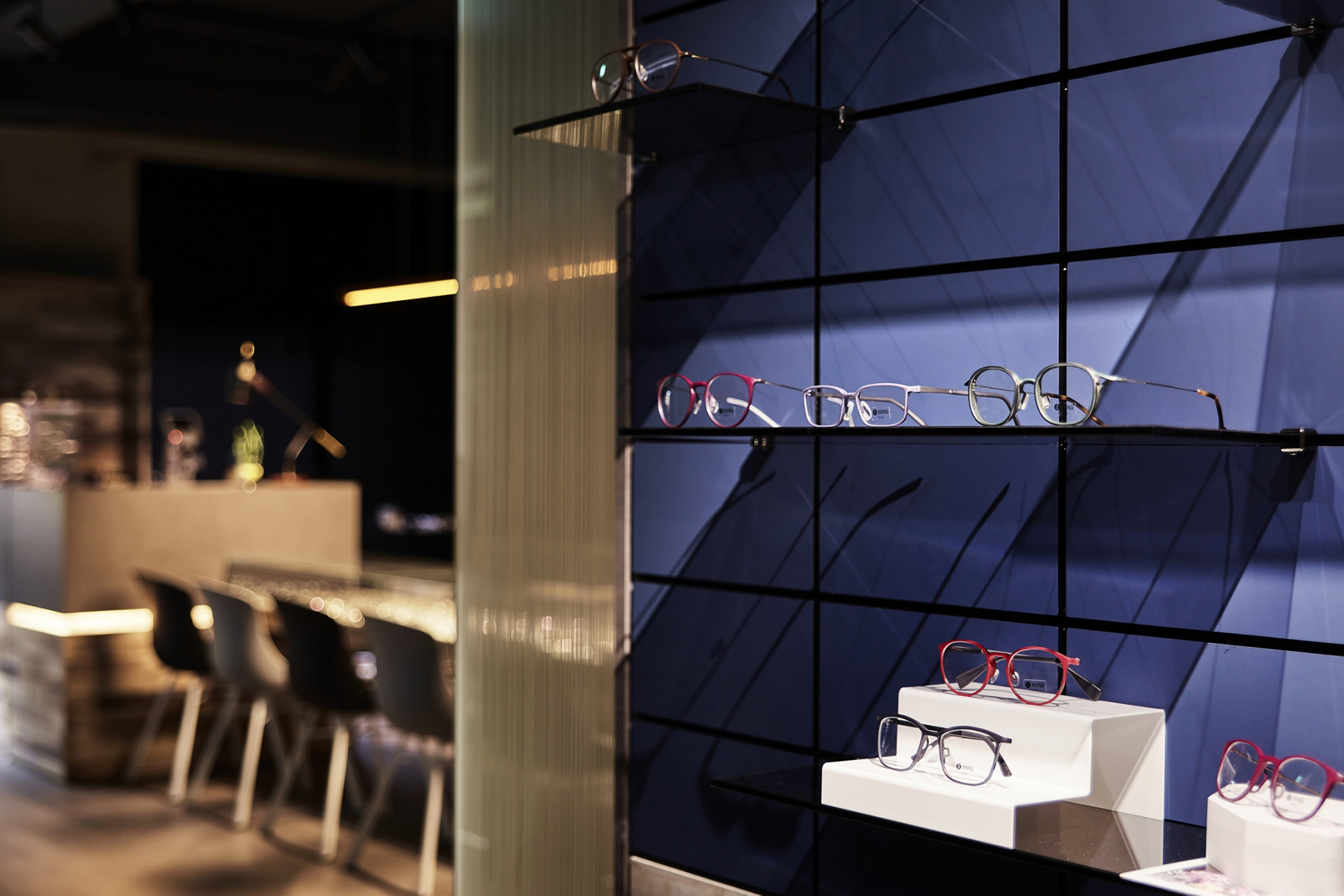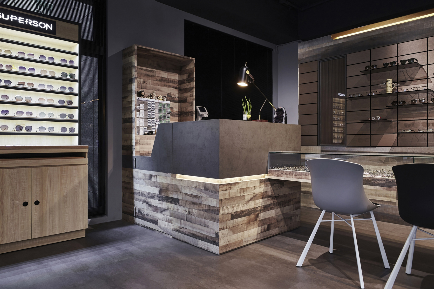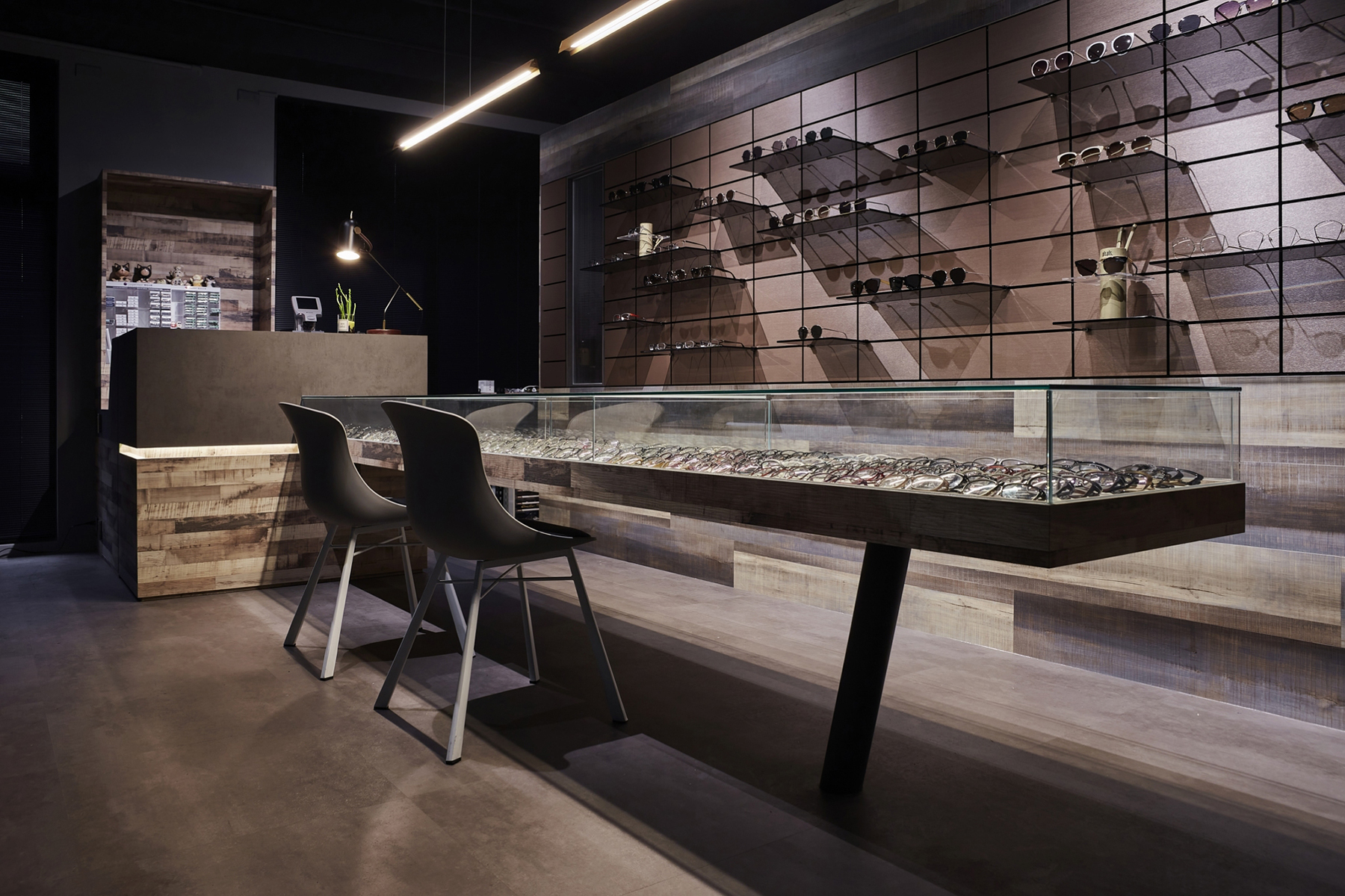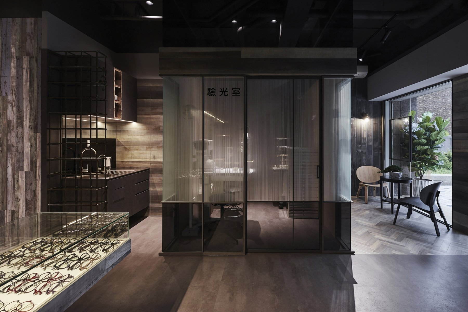 黑、白、灰的純粹語彙,交織出這間極具現代感的眼鏡空間。運用俐落線條與鏡面反射,鋪陳秩序感與細節層次,低調展現品牌專業度。幾何切割與燈光設計穿插其中,彷彿鏡框結構的延伸,塑造理性而富有層次的視覺美感。