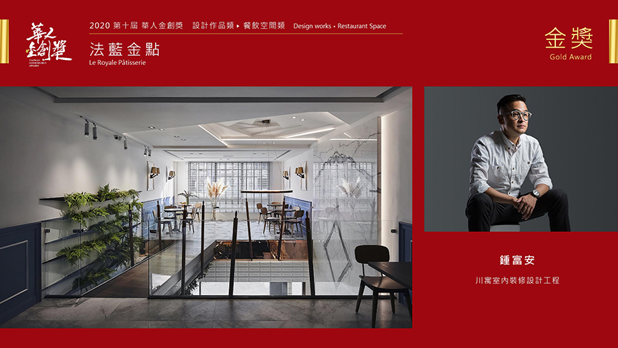 不斷創新求變的 川寓設計 鍾富安 主持設計師 於《法藍金點》作品中,利用業主的法式甜點品牌,在空間呈現多種表徵意象,打造層層堆疊的質感張力,除了滿足前往的賓客在視覺、味覺雙重享受,其精彩設計手法,更榮獲2020華人金創獎「餐飲空間類」的金獎榮耀,將品牌推上至高舞台!
