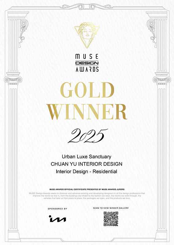 由美國國際設計協會主辦的 Muse Design Awards,長年表彰全球最具創意與影響力的設計作品,是國際設計圈備受肯定的重要獎項。川寓設計憑藉作品 《Urban Luxe Sanctuary》 獲得 2025 Muse Design Awards Gold Winner 金獎殊榮,成功以純熟的設計語彙與深刻的人本思維,讓川寓設計再次登上國際舞台。