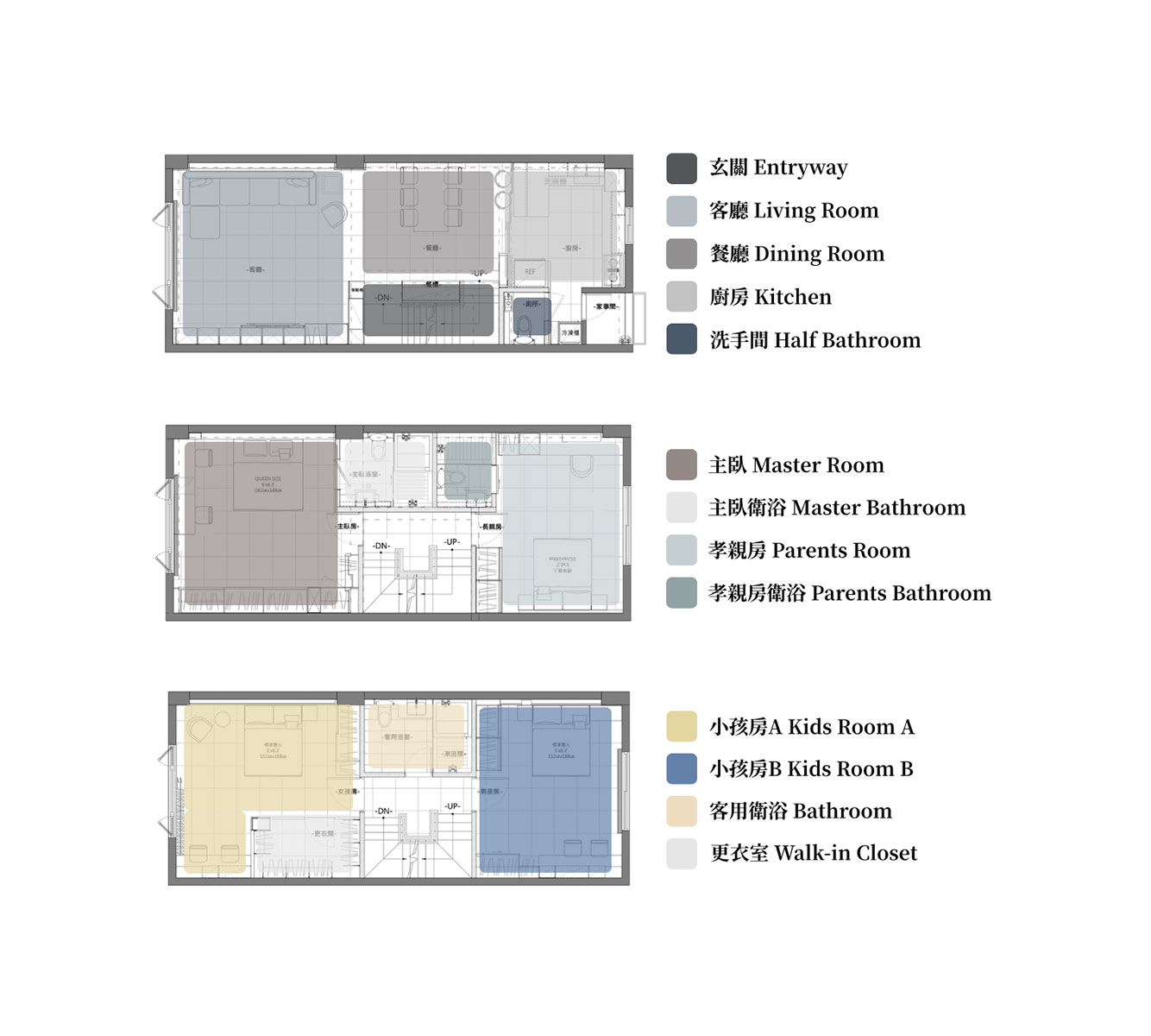 而孩子的房間則以明亮的黃色與藍色點亮空間,象徵夜空中閃爍的星光與朝氣,為家注入活潑、充滿想像力的能量。透過木質元素與公共空間相互呼應,展開一場溫潤且富有節奏感的空間對話。