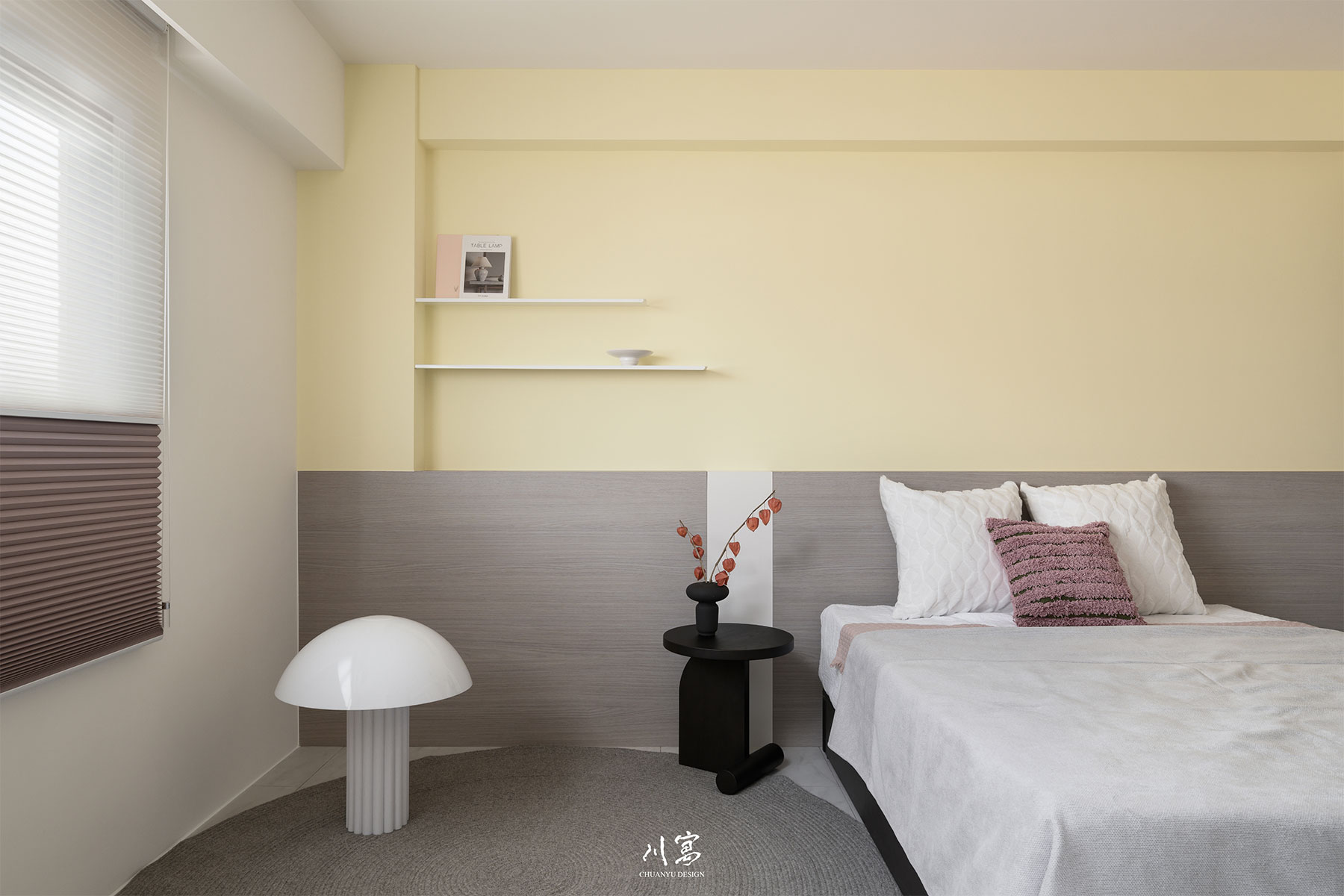 以黃色與藍色區分個別主色調,展現專屬個性的同時,搭配暖木色床頭板,與整體空間材質相互呼應,營造溫暖而富有活力的成長空間。
