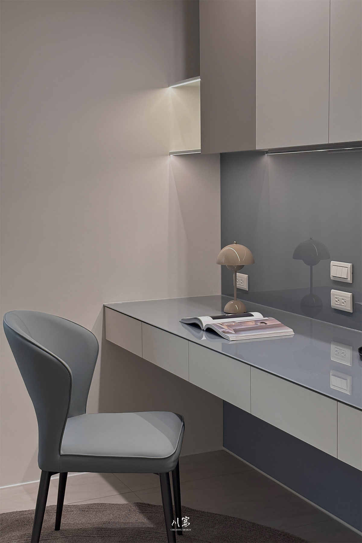 主臥空間轉以柔和暖色調鋪陳,營造靜謐放鬆的氛圍,讓身心自然沉靜下來。窗邊設置書桌區,成為男女主人共享日常靈感與片刻寧靜的小角落。