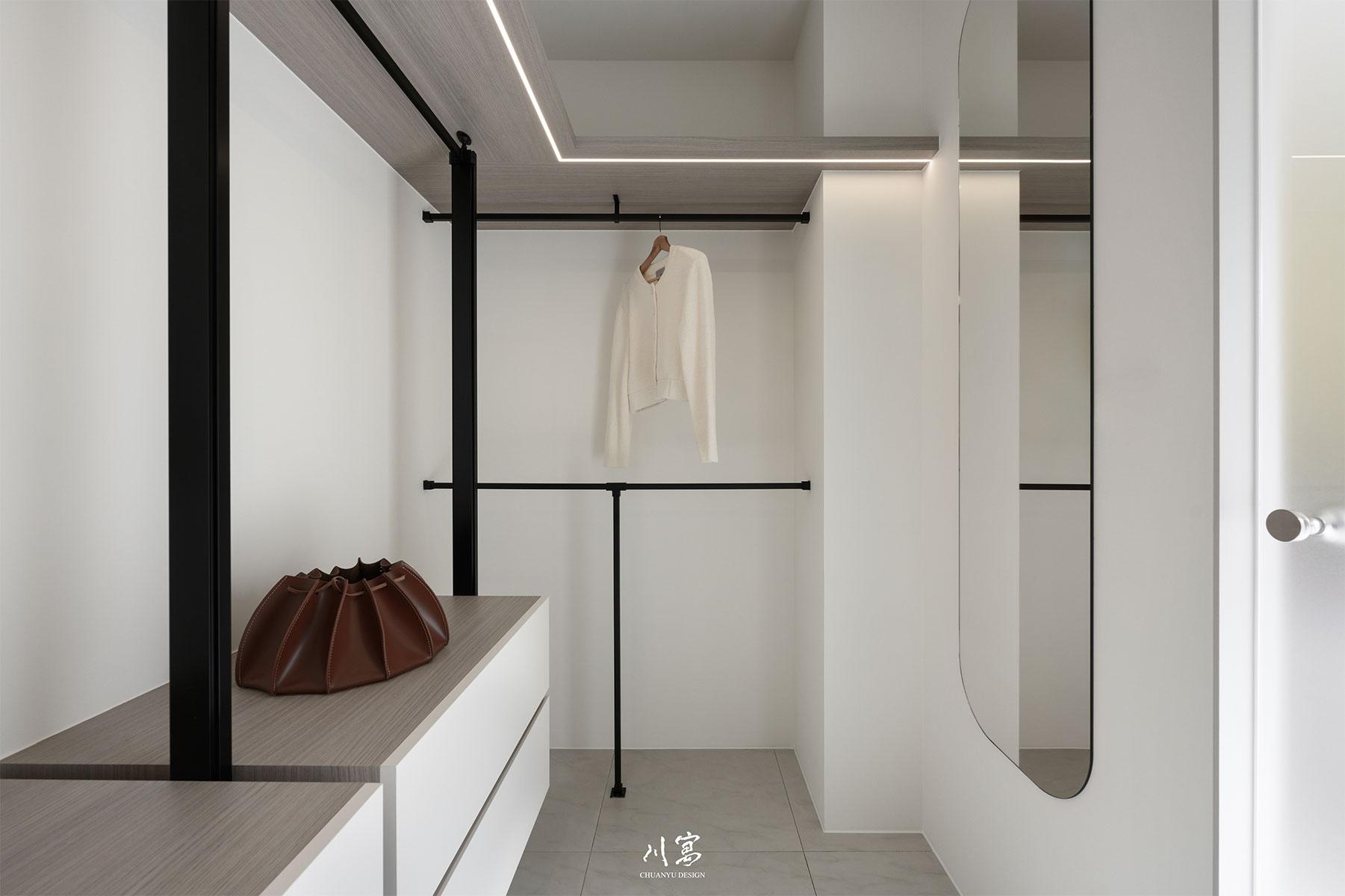 更衣室規劃為步入式設計,搭配大量開放式衣架與下方抽屜收納,方便一目了然地挑選與整理日常穿搭,同時兼顧機能與俐落美感。