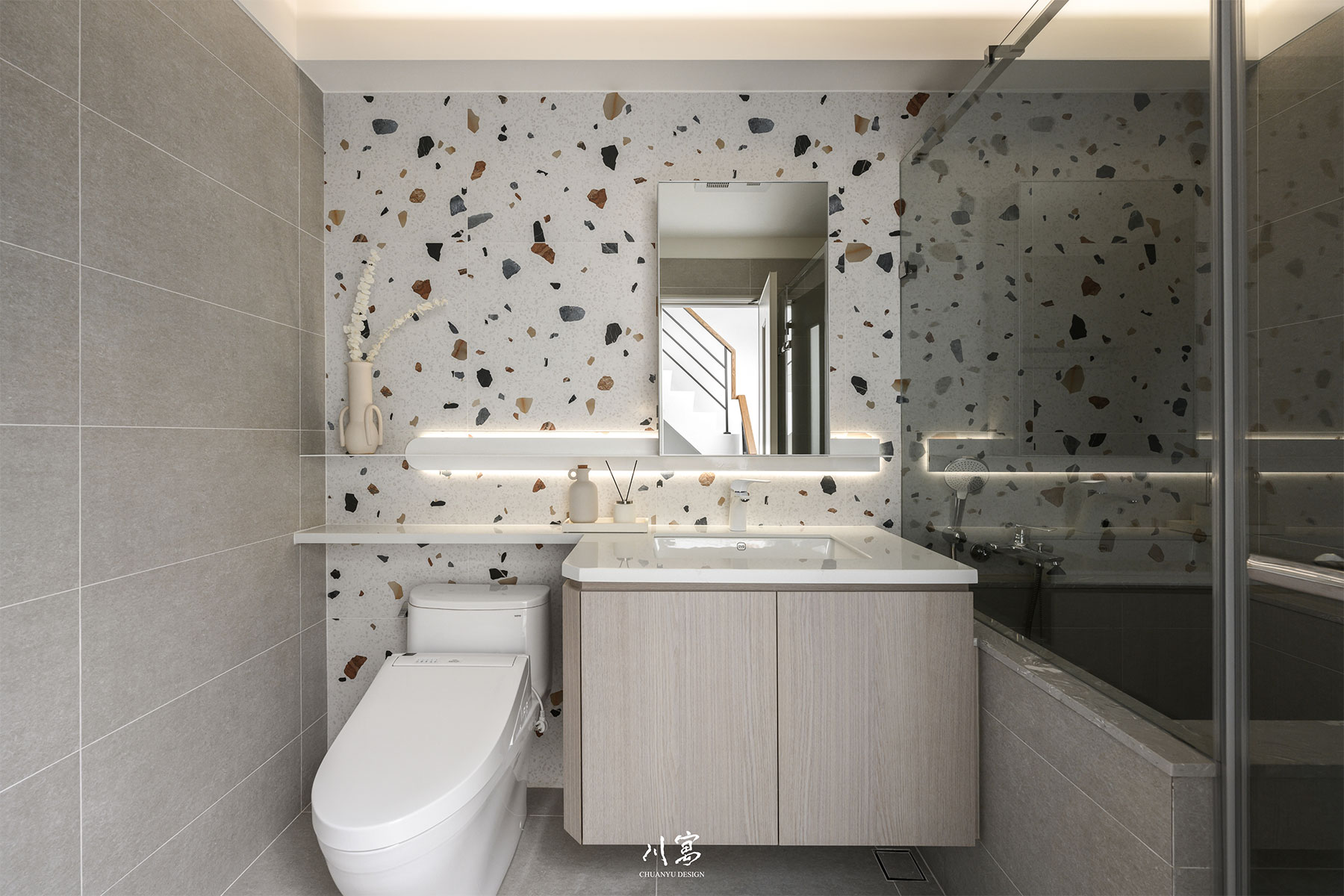 孩子專屬的衛浴空間選用色彩繽紛的水磨石磁磚,搭配暖色系收納櫃,在童趣氛圍中兼顧實用與舒適,讓日常清潔成為輕鬆愉快的時光。