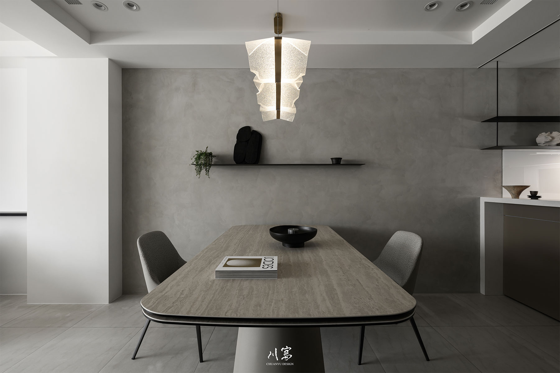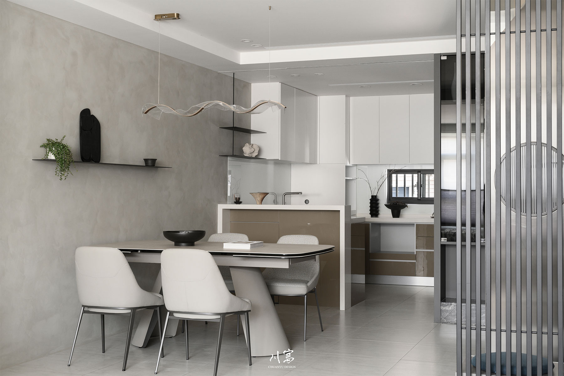餐廳以波浪造型吊燈為視覺焦點,柔化空間線條,搭配可展示家庭回憶的小物櫃體,增添生活溫度。